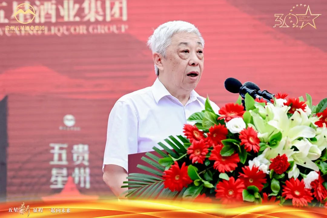 活動現場,中國酒類流通協會常務副會長劉員;中國酒業協會副秘書長杜小威;中國食品工業協會副會長王遵;中共遵義工商聯黨組書記、遵義市統戰部副部長、常務副主席吳疆;仁懷市政協主席王強;仁懷市政協副主席焦林;仁懷經開區黨工委委員、管委會副主任陳圣佐;貴州省釀酒工業協會理事長、白酒專家委員會副主任委員黃平;貴州省酒文化研究會會長梁正;貴州省白酒商會會長兼貴州省白酒促進會副會長丁遠懷;貴州大學釀酒與食品工程學院院長邱樹毅;前茅臺總工、遵義市酒業協會會長呂云懷;遵義市酒業協會常務副會長兼秘書長呂玉華;仁懷市酒業協會常務副會長、秘書長劉幫濤;仁懷市酒文化研究會會長李武;福建省酒類流通協會副會長兼秘書長汪慶璋、重慶市酒類流通商會秘書長鄭孝平;湖南省酒業協會秘書長鄭應平;貴州省白酒企業商會副秘書長周山榮;行業專家張權圖、呂咸遜;中國白酒工藝大師陳孟強;原茅臺酒廠副總工陳興希;國家級評酒委員陳處達;國家級白酒專家周筱春等政府領導、酒行業協會領導、國內著名白酒品評專家、行業專家、全國經銷商客戶、戰略合作單位、封壇貴賓等諸多大咖共千余人蒞臨現場,共同見證五星酒業三十周年榮譽時刻。