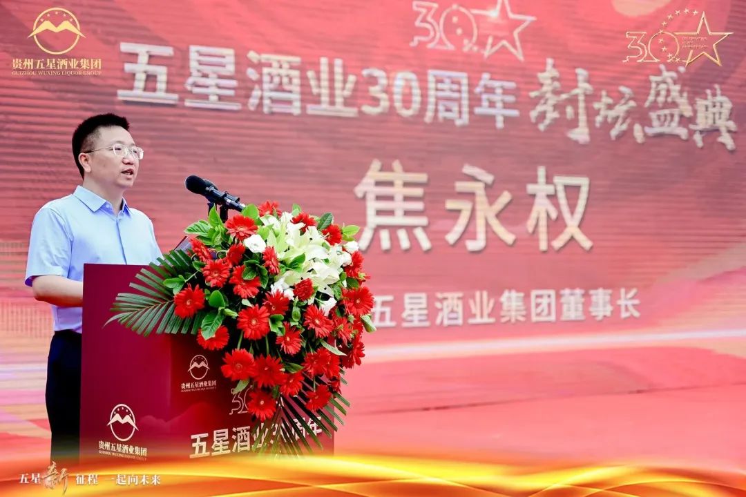 首先,貴州五星酒業集團創始人焦永權率先上臺致辭。他代表五星酒業對現場各位來賓的到來表示了熱烈歡迎,并回顧了五星酒業三十年的歷史與發展。董事長焦永權指出,五星酒業能發展到今天,離不開每個五星人的堅持,未來五星酒業將繼續秉承“傳承工匠精神,帶給客戶好酒”的企業使命,繼續為醬酒行業的發展貢獻一己之力。